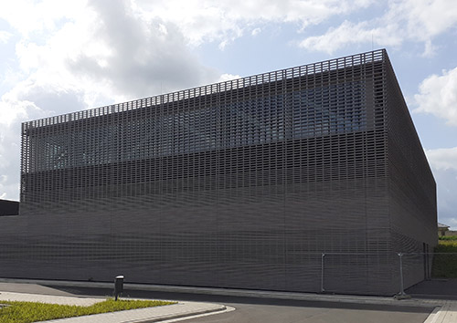 Das “Außenfoyer“ ist ein ca. 15m x 15m großer stützenfrei überdachter Platz. Die Überdachung bildet eine 70cm dicke Verbundplatte aus Brettsperrholzplatten oben und unten sowie dazwischen liegenden BSH-Balkenlagen. Eine darin exzentrisch angelegte Öffnung mit d=8,30m ermöglicht die Ansiedlung eines großformatigen Baumes.