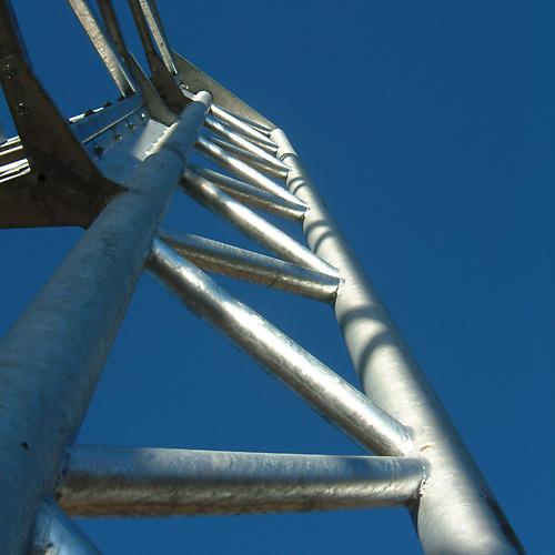 Der Aussichtsturm wird als Stahlskelettkonstruktion errichtet und mit Holztafeln verkleidet. Vier als Fachwerke aus gebildete Stützen tragen eine begehbare Ebene und ein Dach. Gleichzeitig bilden die Stützen, die unter 45 Grad zu den aus Fachwerkträgern bestehenden Wandebenen des Turmes angeordnet werden, mit diesen aufgelöste Rahmenkonstruktionen und steifen so die Gesamtkonstruktion aus. Eine einläufige Treppe aus Stahl führt auf die Aussichtsebene.