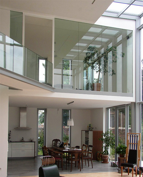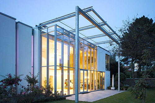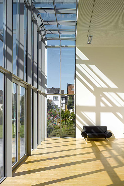 Der Wohnraum, der sich über zwei Geschosse erstreckt, wird im Süden durch eine 6m hohe Stahl-Glas-Fassade begrenzt. Diese wurde als Halbrahmen ausgebildet, um sich in den angrenzenden Flachdachbereich fortzusetzen. Das Profil des Halbrahmens bildet einen 4cm breiten H-Querschnitt, der aus drei Flachstählen mit nicht sichtbaren Senkkopfschrauben zu einem scharfkantigen Querschnitt verschraubt ist. Die Herausforderung lag in den vielfältigen tragkonstruktiv bearbeiteten Details.