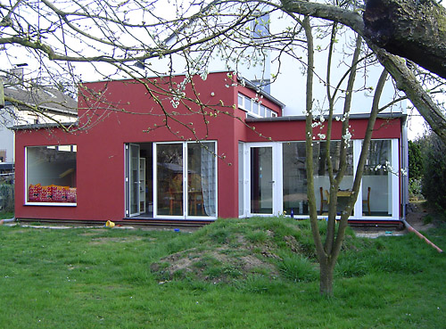 Ein in Leverkusen in Massivbauweise erstelltes Wohnhaus wurde durch einen dreischiffigen Anbau in Holztafelbauweise erweitert. Das Mittelschiff ist höher als die beiden Seitenschiffe des Anbaus. In Längsrichtung befinden sich auf beiden Seiten Lichtbänder und große Öffnungen in dem Mittelschiff.