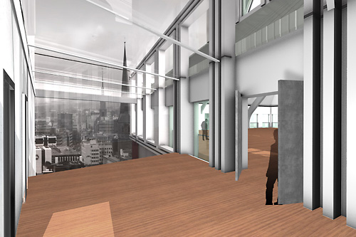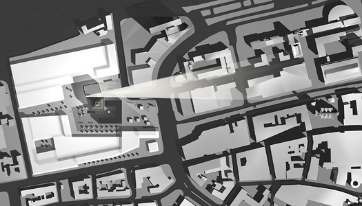 Der ehemals geschlossene, abweisende Charakter des Industriebaus wird durch einen beherzten Einschnitt aufgebrochen. Hier öffnet sich das Gebäude nach außen mit dem belebten Bereich der zentralen vertikalen Erschließungshalle.