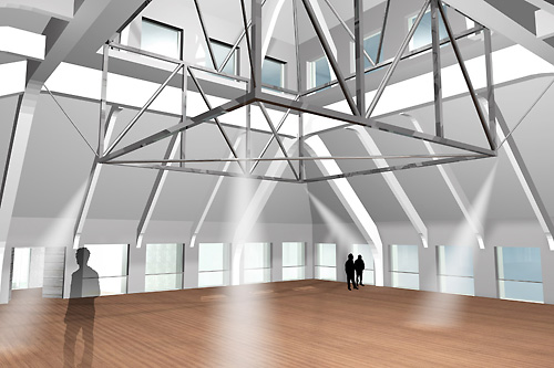 Die Kathedrale soll stützenfrei werden. Dazu sollen Fachwerke mit räumlicher Unterspannung ergänzt werden. Die Entfernung einer Deckenplatte wurde geplant. Die vorhandenen Stützen sind mit der neuen Knicklänge 2 x l weiterhin tragfähig.