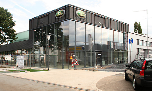 Das Gebäude zeigt nun eine dynamische Fassade, die mit einem markanten umlaufenden Band die Ausstellungshalle von der dahinter befindlichen Werkstatt trennt. Die Elemente des Bands sind als Füllungen in Holzrahmenbauweise in das Stahltragwerk eingebaut.