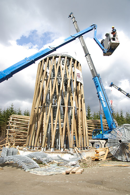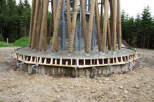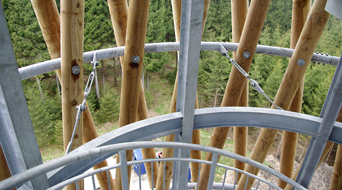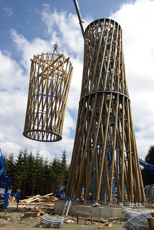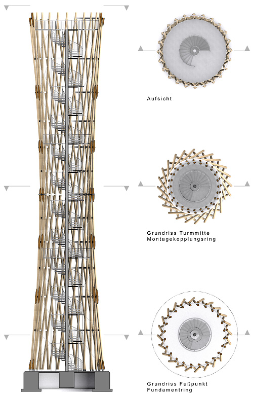 Als Geometrie wurde ein Rotationshyperboloid gewählt. In dieser Form vereinen sich Vorteile einer offenen, filigranen Architektur mit einer effizienten und holzbaugerechten Tragstruktur. Durch die Offenheit tritt der Turm nicht als monumentale Masse gegen die vorhandene Natur an, sondern unterstreicht in seiner Leichtigkeit und seiner Bauweise das Vorhandensein des Waldes. Der Turm ist wie seine drei Plattformen - oben und zweimal in den Drittelspunkten - rotationssymmetrisch. Er gibt dem Benutzer keine bevorzugte Blickrichtung vor.