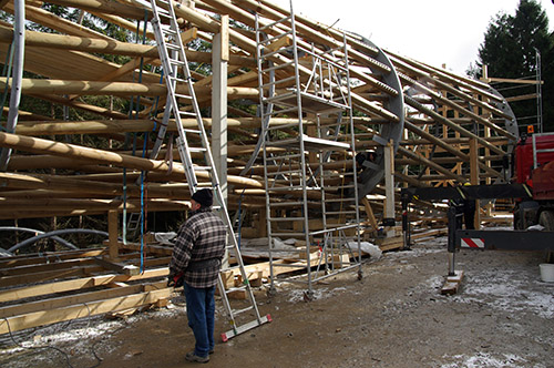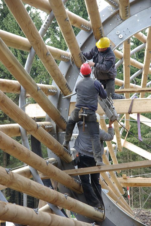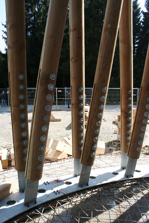 Die Geometrie des Tragwerkes ist holzbaugerecht, da nur gerade Rundstäbe und gelenkige Verbindungen verwendet werden. Mit dem rund gefrästen Douglasienholz wurde ausschließlich heimisches Schnittholz verwendet.