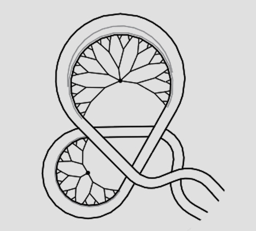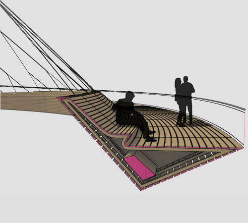 Eine Reihung von drei Kreisringträgerbrücken ergibt einen dreidimensionalen „Knoten“. Innerhalb der beiden größeren Kreise werden Pylone positioniert, die durch eine einseitige Abspannung der Kreisringträgerbrücken tragen. Die Seile der Abspannung verästeln sich zunehmend und greifen das Thema natürlicher Formfindungsprozesse auf.