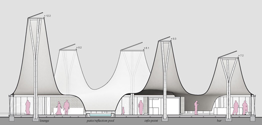 (2) aus der Membrankonstruktion (inkl. Stahlverbindungen und Seile), die auf Basis ihrer zweiachsigen Krümmung an jeder Stelle mittels Vorspannung stabilisiert wird. Diese kann in Deutschland produziert und leicht von Ort zu Ort transportiert werden.