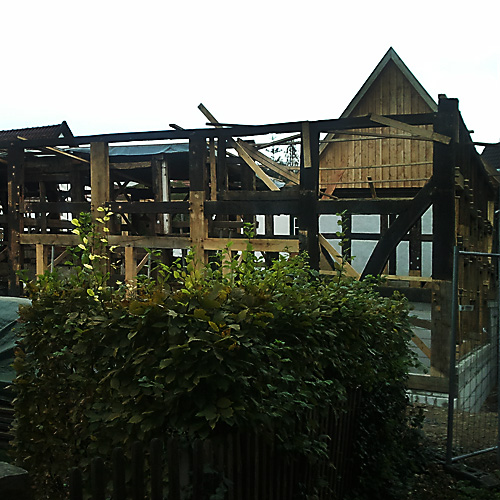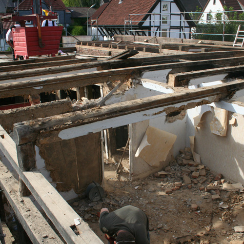 Um das Gebäude zu erhalten und einer ganzjährigen Nutzung zuzuführen, wurde das Dach zurückgebaut, das Ständerwerk freigelegt, ausgerichtet, defekte Hölzer ausgetauscht und die sanierte Balkenkonstruktion auf neue Fundamente gestellt.