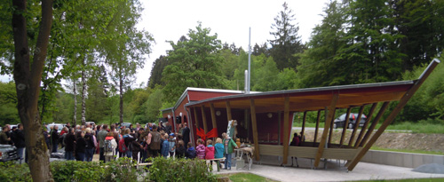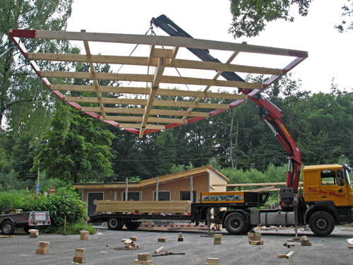 Der “Schiffsrumpf“ aus Holz, welcher über schräg stehende Rippen als Spanten ohne eine Bekleidung stilisiert ist, weist eine Länge von ca. 22,80m und eine Breite von ca. 6m auf. Die Überdachung über dem “Vorschiff“ erhält eine Diagonalschalung aus Vollholz. Das Dach über dem hinteren Teil, der “Kajüte“, ist teils als Schrägdach, teils als Flachdach ausgebildet.