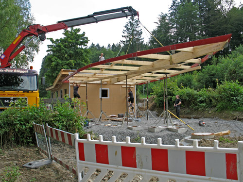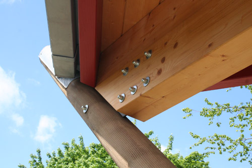 Durch die geschlossene Überdachung, die alle Holzbauteile – außer dem Steven-Balken abdeckt, sind die Kopfpunkte der Stützen und die Pfetten des Vordachs vor direkter Beregnung geschützt. Der Steven und die Randhölzer der Schalung sind seitlich durch eine Blechabdeckung geschützt.