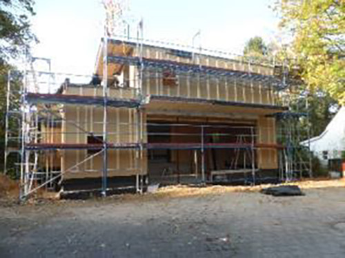 Ursprünglich war vorgesehen, das Bestandsdach über den Garagen abzureißen und durch einen zweigeschossigen Baukörper mit Flachdach zu ersetzen. Die Untersuchung des Baugrunds und der Bestandsfundamente ergab eine nicht ausreichende Tragfähigkeit des Untergeschosses mitsamt der Gründung für den Aufstockungskörper. Daher wurde sich für einen Komplettneubau unter Beibehaltung des Splitlevels für das Erdgeschoss und einer darüberliegende Aufstockungsebene entschieden.
