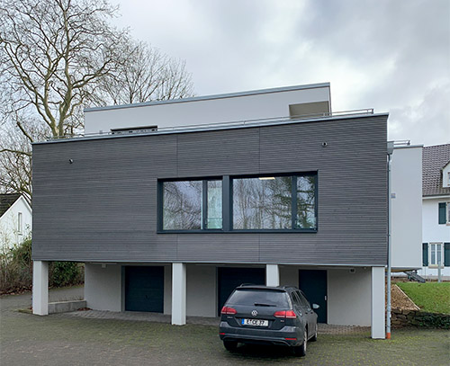 Das Bestandsgebäude aus den 1960er Jahren beinhaltete eine Hausmeisterwohnung als Dachausbau mit Splitlevel im EG/ 1.OG über den hangseitig tieferstehenden Garagen.
