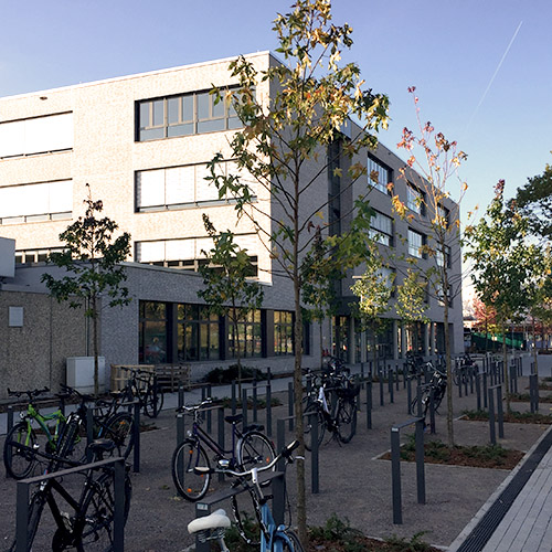 Die Schulerweiterung (ca. 8.000m²) wurde mit vier Vollgeschossen realisiert. Das L-förmige Gebäude wird in Erdgeschoss durch große Verglasungsflächen und im Grundriss hervorspringende Raumkuben (Musikraum, Lehrerzimmer etc.) aufgelockert. In Teilbereichen ist das Gebäude unterkellert.