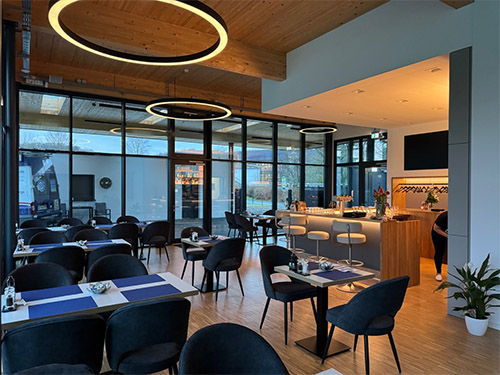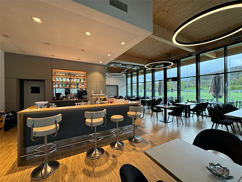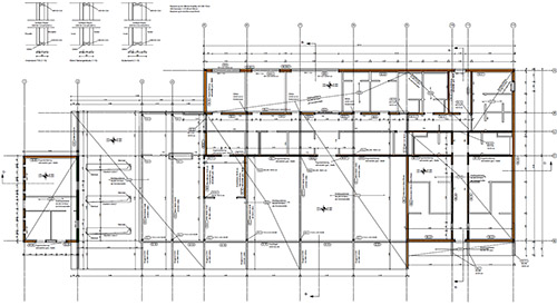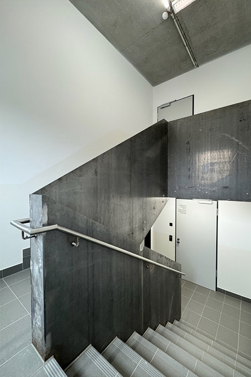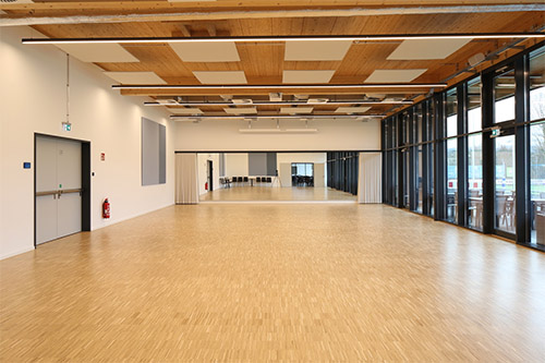Das Gebäude ist teilunterkellert. Das EG wurde vollständig in Holzrahmenbauweise geplant. Die Dächer aus Brettstapelelementdecken werden in den großen Räumen durch BSH-Binder auf schlanken Stahlstützen getragen.
