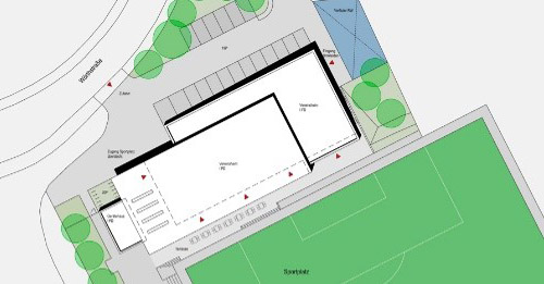 Der Baukörper gliedert sich in einen niedrigeren Trakt mit Verwaltung und Umkleideräumen sowie einen höheren Hallenbaukörper mit einer Gaststätte und einem großen Veranstaltungsraum. Das im Eingangsbereich weit ausladende Hallendach markiert den Hauptzugang zum Sportgelände und dient als Wetterschutz bei Veranstaltungen.