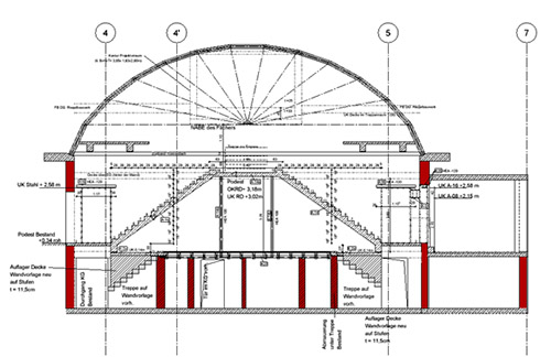 In der vorhandenen Statik fehlten u.a. die Nachweise des Stahlbetonbalkens auf der Mauerkrone des Saals und der Knotentragfähigkeit. Nachweise des Mauerwerks hinsichtlich des Knickens wurden damals nicht geführt. Auch Angaben zur Ausbildung der Endkappe, Endbögen, Gratbögen, Fußpunkten, Ringankern, Auflagern und den Wandanschlüssen fehlten. Ebenso undokumentiert waren Umbauten und Maßnahmen zur Beseitigung von Bergschäden aus den 70er Jahren.