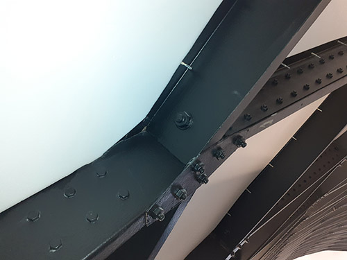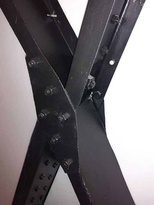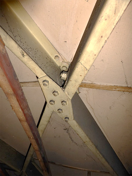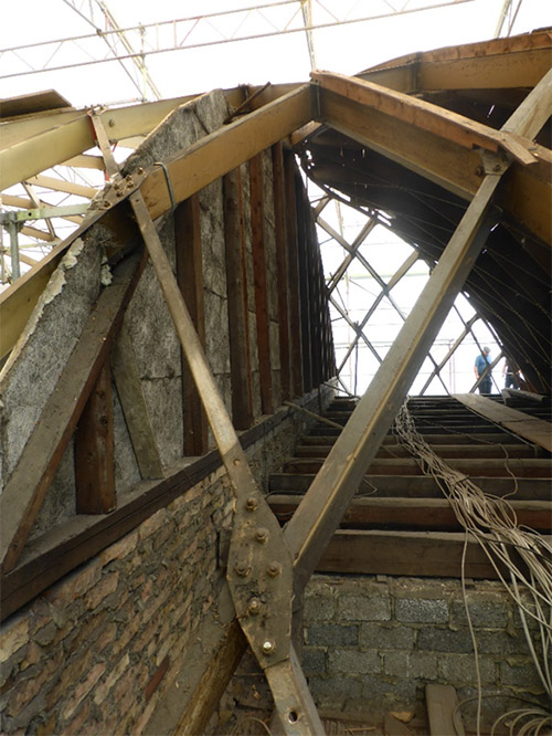 Zur Ertüchtigung der Konstruktion wurden daher der Randbogen der Tonne durch einen Flachstahlfächer ausgesteift und die gefährdeten Stäbe durch zusätzlich aufgeschraubte Flachstähle verstärkt. Auch im Massivbau wurden zahlreiche Maßnahmen durchgeführt.