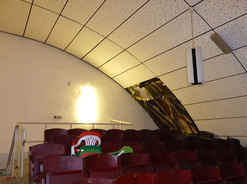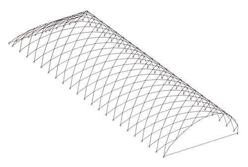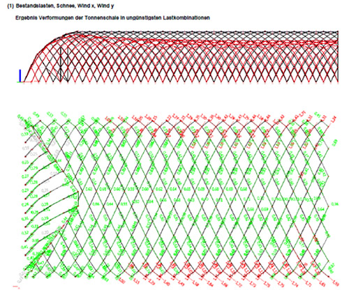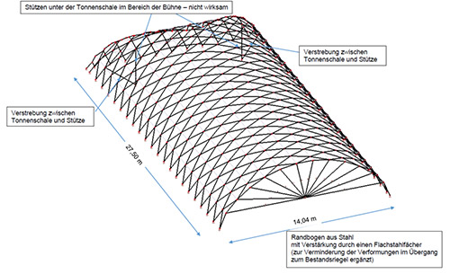 Entsprechend wurde nach unterseitiger Öffnung der Dachkonstruktion zunächst die Schalen- und Stabgeometrie vollständig erfasst und tragkonstruktiv bewertet. Die Analyse der Knoten, mit denen die einzelnen Stäbe der Rauten-Lamellenschale gekoppelt wurden, zeigte, dass eigentlich nur eine der Tragrichtungen belastet wird. Das Zugband am „offenen“ Ende der Tonne schließt zudem nur den Ringanker, nicht aber die gesamte Tonnenschale.