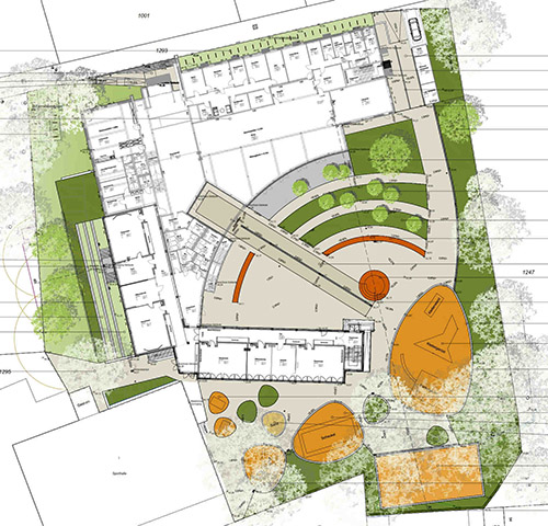 Daraus ergab sich die Aufgabenstellung zur Erweiterung, zum Teilneubau nach Abriss und zur Bestandssanierung der Schule auf insgesamt vier Züge bei laufendem Betrieb des Bestandes. Klassencontainer ersetzen für die Bauzeit einen Teil der Räume. Teile des Altbaus wurden entfernt. Der Neubau beginnt in 2022 mit Pfahlgründungen.