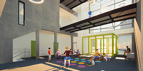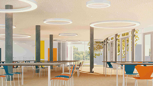 Die Neubauteile werden in Stahlbetonskelettkonstruktion mit vorgehängten Fassaden in Holzrahmenbauweise erstellt. Im Projekt werden Lernräume in Form von Lernclustern umgesetzt.