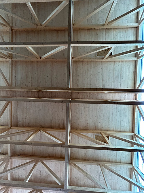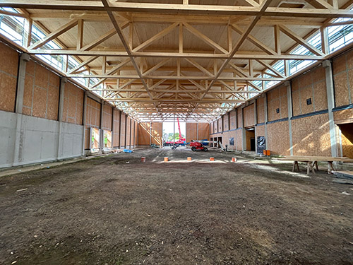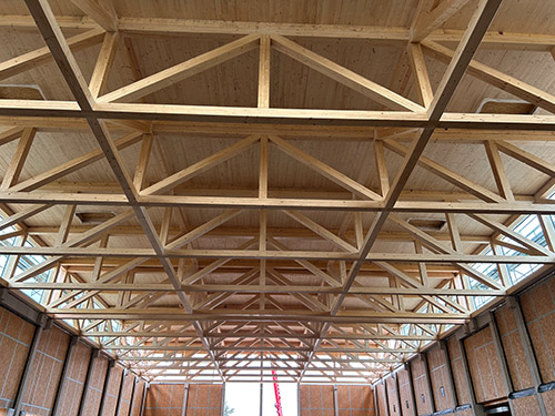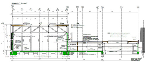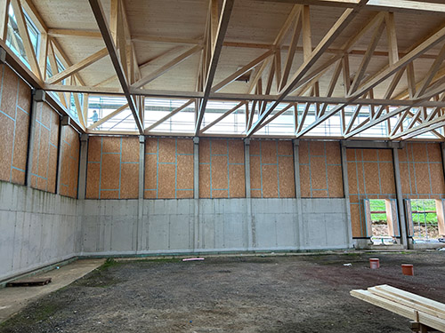 Zwischen den beiden Hallen entsteht ein eingeschossiger gemeinsamer Erschließungsbereich, der auch für Umkleiden, Besprechungsräume etc. genutzt wird. Dieser Bereich wird mit Brettstapeldecken und Brettsperrholzwänden ausgeführt.