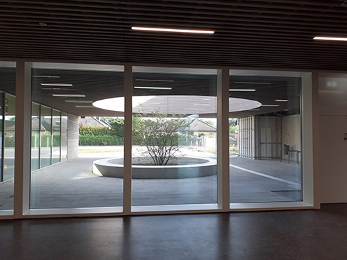 Das “Außenfoyer“ ist ein ca. 15m x 15m großer stützenfrei überdachter Platz. Die Überdachung bildet eine 70cm dicke Verbundplatte aus Brettsperrholzplatten oben und unten sowie dazwischen liegenden BSH-Balkenlagen. Eine darin exzentrisch angelegte Öffnung mit d=8,30m ermöglicht die Ansiedlung eines großformatigen Baumes.