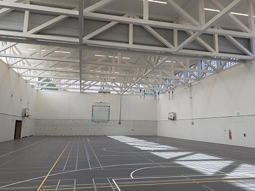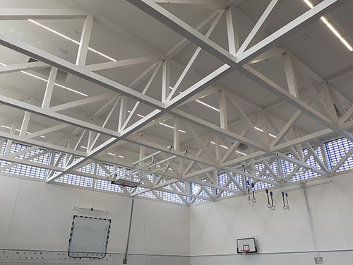 Da die Bestandssporthalle in Stahlbauweise mit Mero-Raumfachwerk für die Nutzungen durch Schulen und Vereinssport nicht mehr ausreicht, wird Sie durch eine neue Zweifeldsporthalle in Holz und Betonhybridbauweisen mit einem sichtbarem Holz-Raumfachwerk auf fußeingespannten Stahlbetonstützen ergänzt.