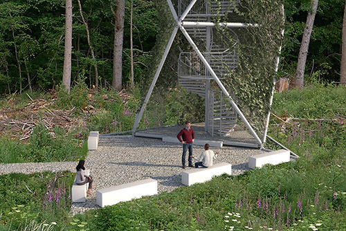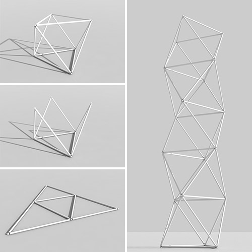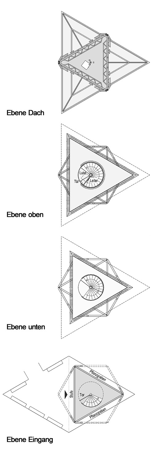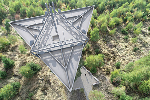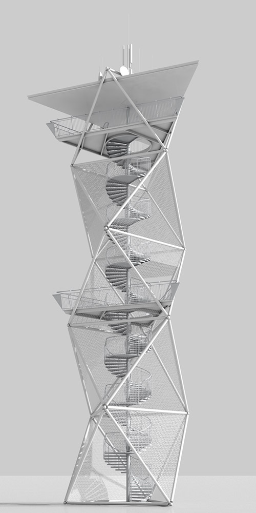 Die auf ein effektives statisches System reduzierte Konstruktion besteht aus fünf aufeinander angeordneten Oktaedern mit eingestellter Stahltreppe. Alle Stäbe der Oktaeder sind feuerverzinkte Stahlrohre mit gleichbleibendem Außendurchmesser.