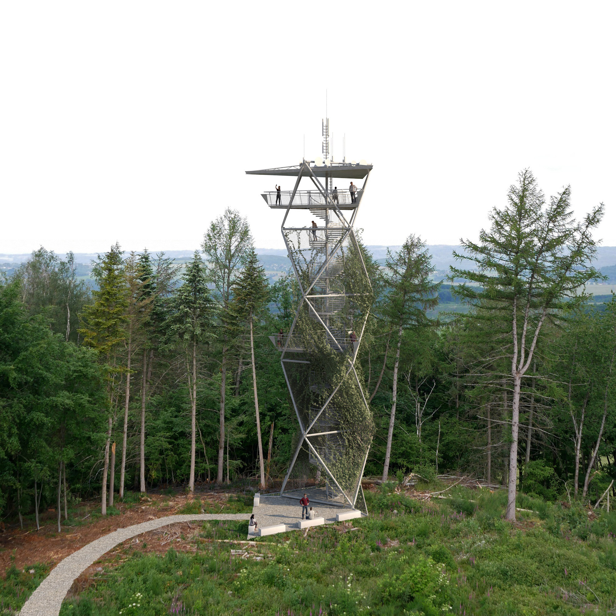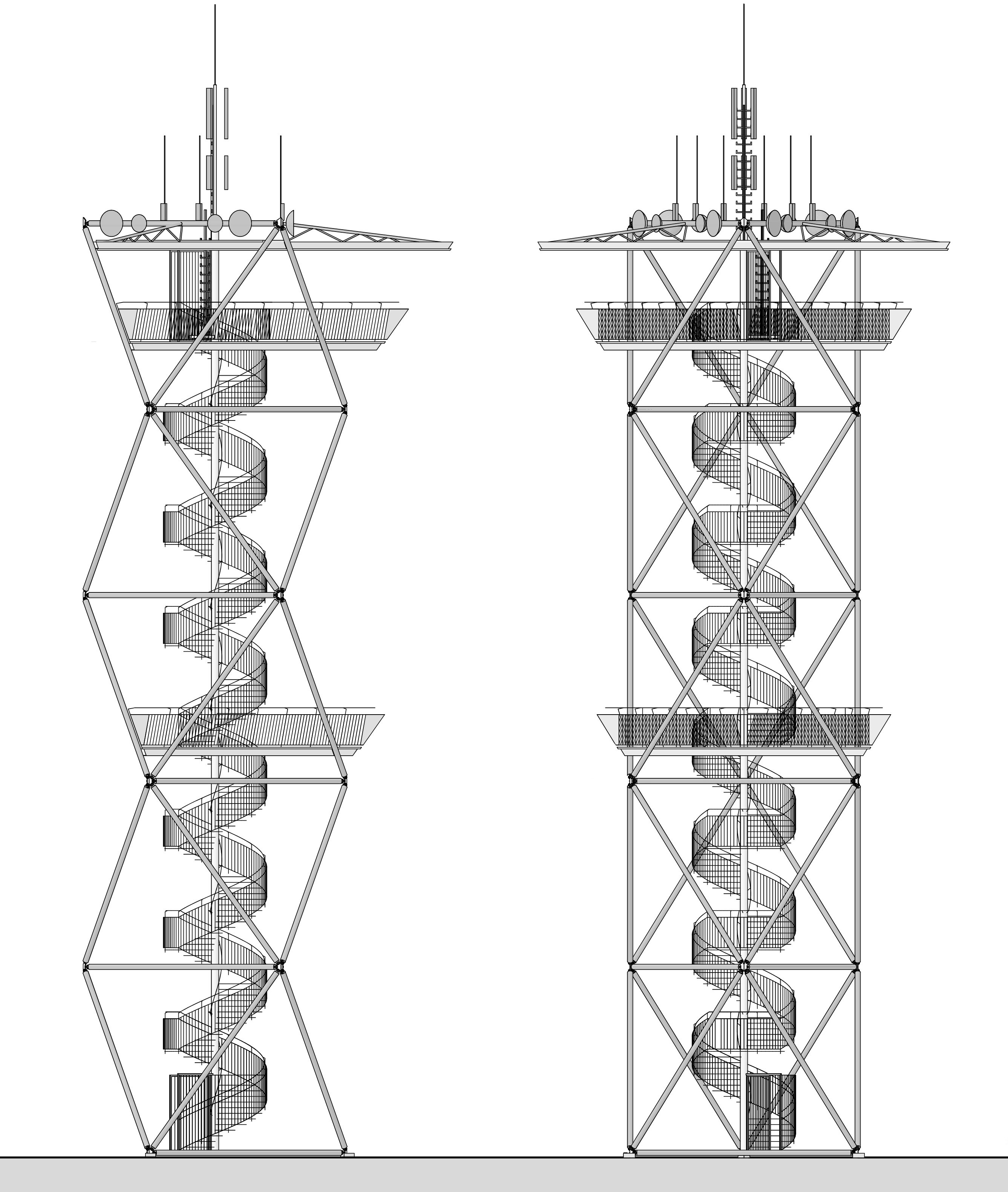 Innerhalb der Tragstruktur entwickelt sich die von der Höhenentwicklung der Oktaeder unabhängige Spindeltreppe, die je Umlauf durch ein Viertelpodest unterbrochen wird. Das vierte Podest erweitert sich in ca. 12m Höhe zu einer ersten kleineren Zwischenplattform. Beim achten Podest befindet sich die dreieckige Aussichtsplattform in rund 24m Höhe.