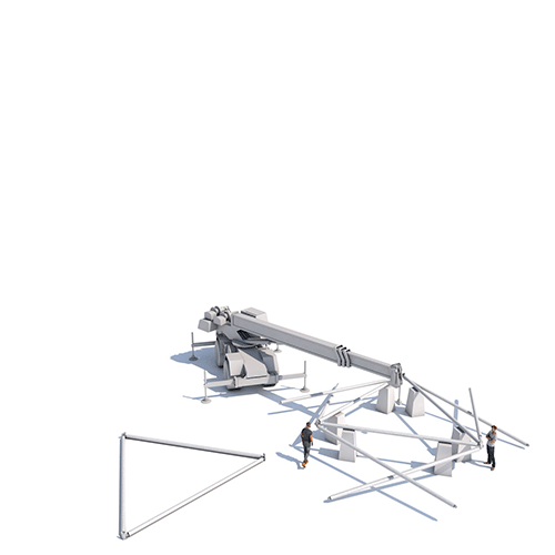 Entsprechend der tragkonstruktiven Erfordernis verjüngen sich nur von unten bis oben die Wandungsdicken der Rohre. Einfach herzustellende Stahlteile aus verschweißten Blechen bilden die Knotenpunkte der Primärkonstruktion. Zum Anschluss eines Stabes reicht je Ende eine Schraube. Dies ermöglicht auch eine sehr einfache Montage per Autokran.