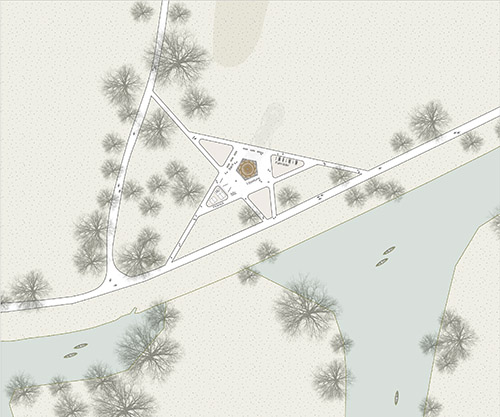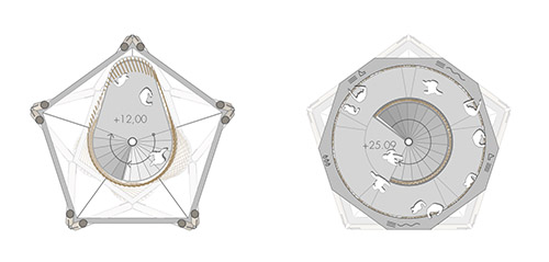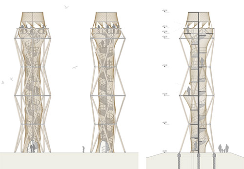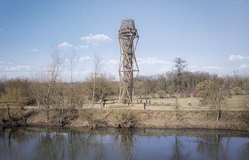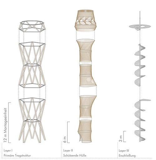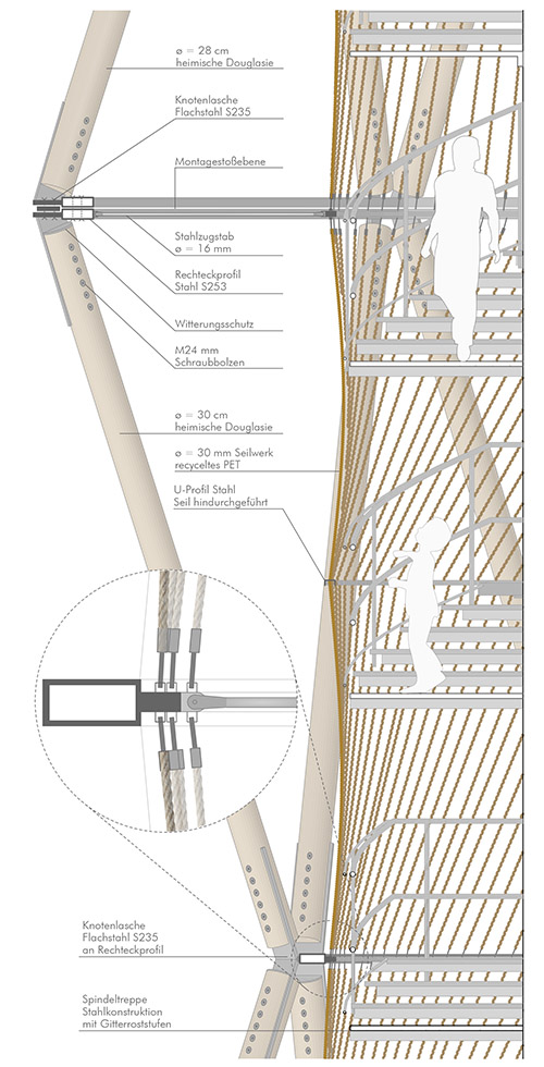 In Anlehnung an die fünfblättrige Lipperose wurde als primäre Geometrie ein fünfeckiger Grundriss gewählt. Dieser wird je 6m Höhe von 10 Vollholzquerschnitten getragen. Diese Hölzer aus der seit ca. 175 Jahren heimischen Douglasie verjüngen sich lastabhängig abschnittsweise von d=32cm (unten) bis d=26cm (unter dem Aussichtsplateau). In dieser Form vereinen sich Vorteile einer offenen, filigranen Architektur mit einer effizienten, holzbaugerechten und sich aussteifenden Tragstruktur. Durch die Offenheit tritt der Turm nicht als monumentale Masse gegen die vorhandene Natur an, sondern unterstreicht in seiner Leichtigkeit und seiner Bauweise das Vorhandensein der Auenlandschaft.