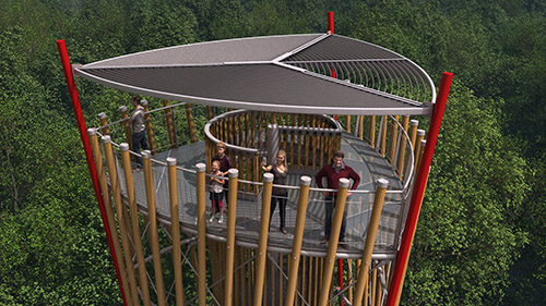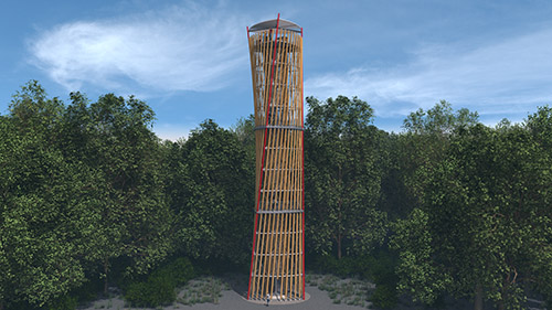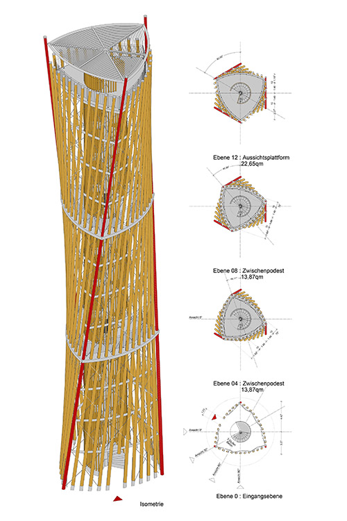 In den Ebenen der Stöße gibt es Zwischenplattformen, die ein Herantreten von innen an die Turmhülle und somit rundherum Ausblick durch die Holzstabebenen ermöglichen. Auch die oberste Plattform auf gut 34,50m Höhe bietet durch das weite Hochziehen der Hölzer hinter dem Geländer einen optisch sicheren Halt.