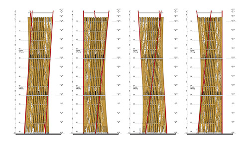 Der Lastabtrag erfolgt über drei farblich markierte Eckstützen aus Stahl sowie jeweils elf dazwischen liegenden Holzstützen. Verbunden werden diese zu schalenartig tragenden Turmhüllen über geschossweise angeordnete Horizontalrohre mit zwischenliegender Aussteifung durch Zugdiagonalen. In den Drittelspunkten des Turms gibt es Montagestöße, so dass je ein Turmdrittel am Boden vormontiert und anschließend per Autokran aufgesetzt werden kann.